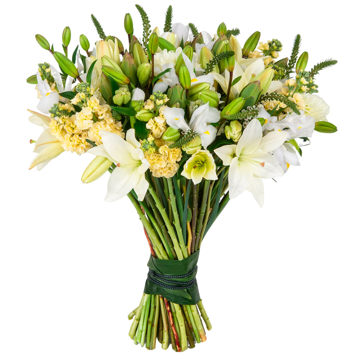 Лилия белая, ирис белый, маттиола желтая, вероника. Упаковка (лента, пленка, крафт, сетка, пленка матовая)